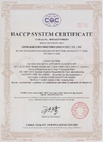 6月秦皇島市海東青食品有限公司榮獲HACCP認(rèn)證證書(shū)